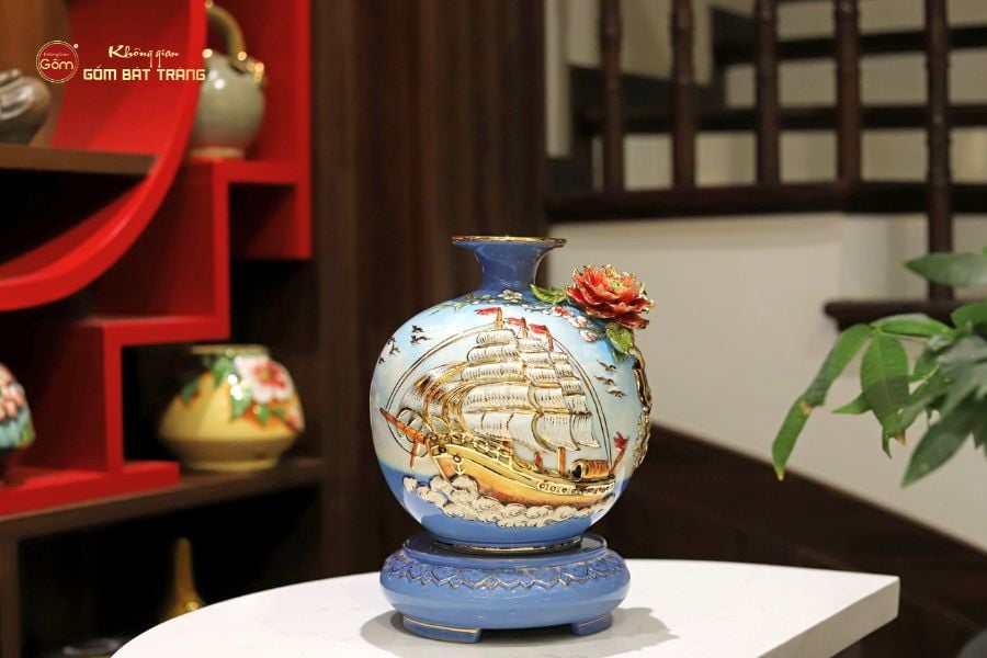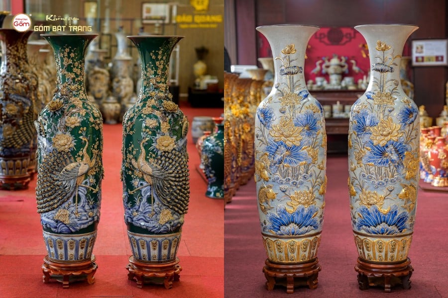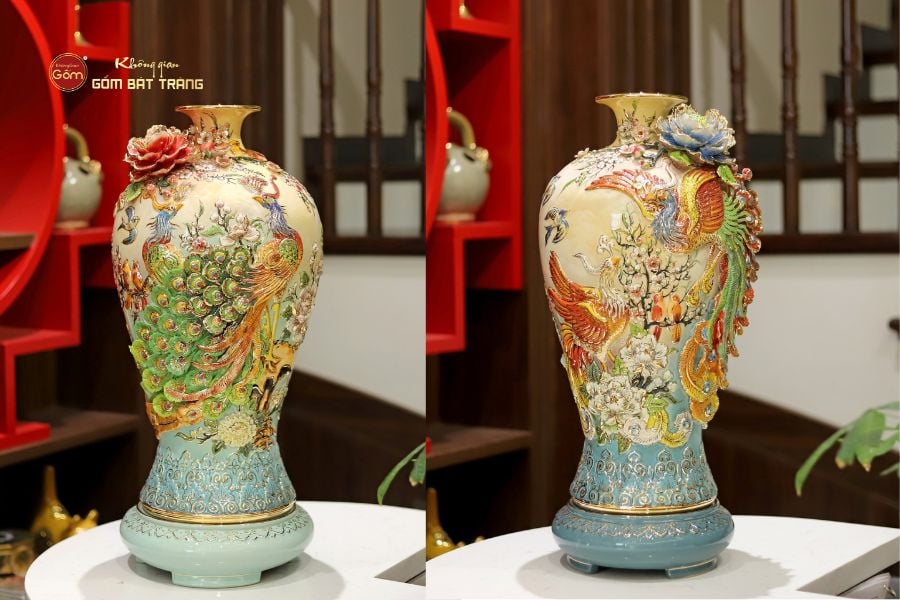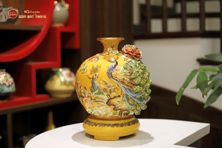 Bình gốm tài lộc Bát Tràng là một vật trang trí được nhiều người yêu thích vì vẻ đẹp sang trọng, hoa văn tinh xảo và có sức hút đặc biệt. Khi đặt bình gốm tài lộc trong nhà, sẽ mang lại cho gia chủ không chỉ may mắn và hạnh phúc mà còn sự thịnh vượng về tài lộc. Các sản phẩm bình gốm tài lộc cao cấp tại Không Gian Gốm được làm hoàn toàn thủ công bởi nghệ thuật đắp nổi và vẽ vàng cao cấp. Họa tiết hoa văn tinh tế mang đậm ý nghĩa nhân văn và phong thủy sâu sắc. Điều này giúp cho bình gốm trở thành một điểm nhấn hút tài lộc cao cấp trong không gian sống, mang lại cảm giác thịnh vượng, phú quý và bình an.